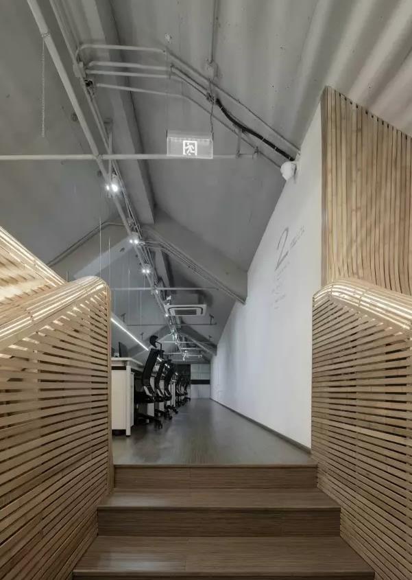 高端文化傳媒辦公室設(shè)計(jì):將竹子的元素運(yùn)用在這里,并還原其本身的色彩。藝術(shù)必須出自于大自然,因?yàn)榇笞匀灰褳槿藗儎?chuàng)造出較獨(dú)特美麗的造型。而竹子作為一種建筑材料代表了古代亞洲建筑體系的內(nèi)涵, 而中國(guó)它的產(chǎn)量是足夠支撐裝飾材料的消耗的,并且有著高韌性、可塑性強(qiáng)的特點(diǎn)。在連接頂層的樓梯部分,我們沒有再讓竹子繼續(xù)沿用直線語素。頂面部分做曲線拼接,延續(xù)而上。